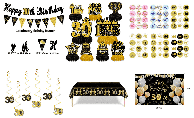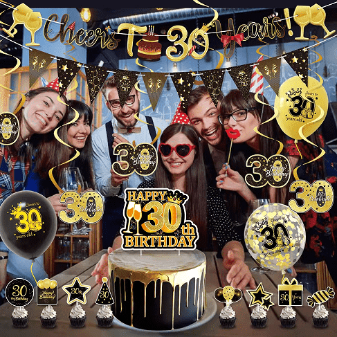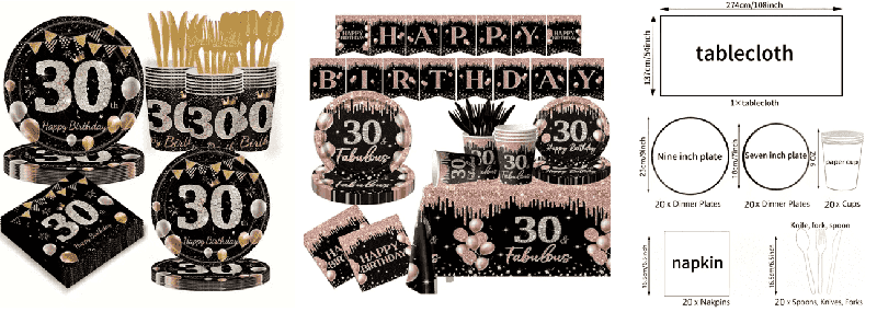 Papieren verjaardagskaart is de kern van taartdecoratie: de hoofdkaart is gebaseerd op woorden als "Happy 30th BIRTHDAY" en past bij de vorm van een champagnekop. Het formaat is groot en geschikt voor het versieren van de hoofdcake. Er zijn ook ronde "30"-logo's, sterren, kronen en andere kleine kaarten, geschikt voor cupcakes, gemaakt van verdikt hard karton, met bamboestokken aan de onderkant, die voor gebruik kunnen worden geplaatst.