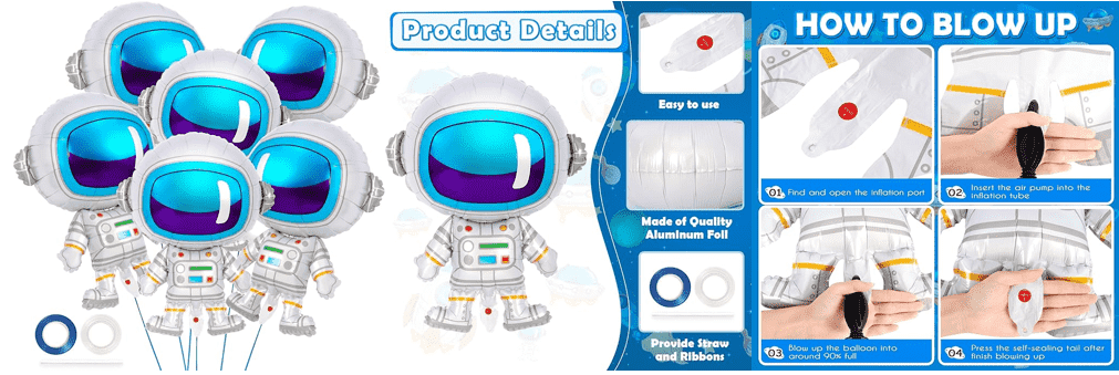 Er zijn veel voorkomende lichaamsvormen van astronauten, die het beeld tonen van astronauten die een ruimtepak dragen, sommige stijlen met een basis, opblaasbaar kunnen staan. Er zijn verschillende maten, zoals 18 inch, 24 inch, 28 inch etc., maar ook enkele grotere ballonnen, zoals staande astronautenfolieballonnen met een hoogte van 65 cm. Het wordt voornamelijk gebruikt voor verjaardagsfeestjes met een ruimtethema, babyverwelkomingsfeesten, kinderkamerdecoratie en andere gelegenheden, die een vrolijke ruimtesfeer aan het evenement kunnen toevoegen.