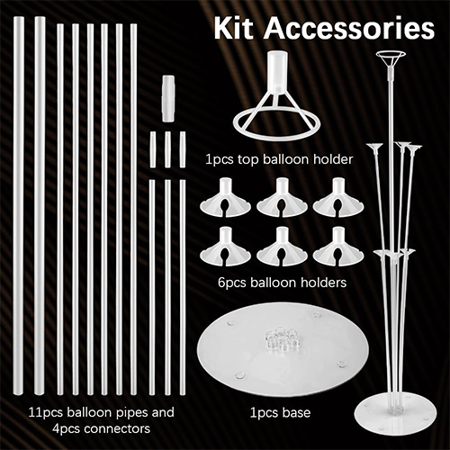 De ballonbodemstandaard bestaat uit een basis, verschillende kopjes, plastic pijpen van verschillende lengtes, gewrichten en een topgasclub. Na de montage kan de ballon worden opgelost om een bureaublad of grondballondecoratiemodel te maken, geschikt voor feest, bruiloft, feest en andere scènellay -out. Ballonstand is handig om driedimensionaal en mooi ballonpak te bouwen.