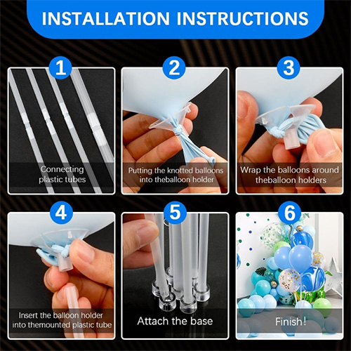 Zoals getoond in foto 2 en afbeelding 3 hieronder, verdeel je eerst de verschillende ballonvloer van de accessoires in categorieën en bepaal je de assemblagepositie van elk accessoire. Vervolgens wordt de plastic buis via de gewricht verbonden, waarna de geknoopte ballon in het gat van de ballonondersteuning wordt geplaatst, wordt de ballonknoop gedraaid en in het andere gat van de gewricht getrokken, en uiteindelijk is de ballonsteun verbonden met de buis, en vervolgens wordt het andere uiteinde van de buis verbonden met de basis met lijm. Een prachtige ballonstandaard is klaar. Bovendien kan de geassembleerde ballon sleeppaal ook gemakkelijk worden gedemonteerd en kan ze worden gebruikt als een speelgoed van een ballonstandhouder voor kinderen, waardoor meerdere toepassingen van één paal en flexibel gebruik worden gerealiseerd. Bovendien kan de gemonteerde ballonvloerstandaard ook worden gebruikt met gekleurde lichten. Als je van gekleurde lichten houdt, kun je gekleurde lichten kopen terwijl je ballonvloer koopt om je activiteiten kleurrijker te maken!