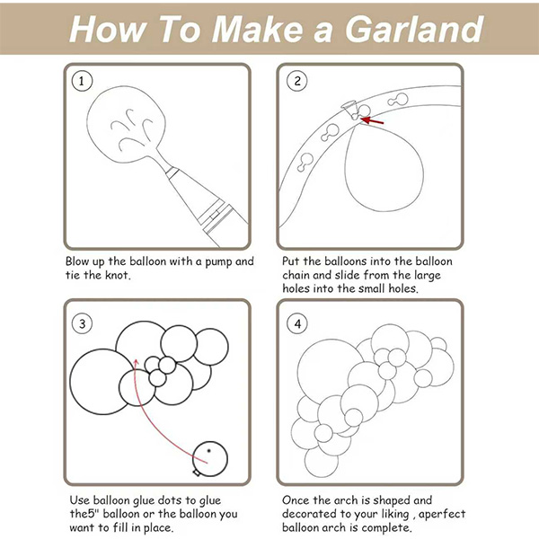 Aandacht en waarschuwing:Vul de ballonnen NIET te vol en vermijd ook zonnebrand, oververhitting, puntige voorwerpen en overmatige wrijving. Controleer de hoeveelheid lucht die in elke ballon wordt opgeblazen om uw ideale ballongrootte te bereiken, geniet van uw Balloon Garland Arch-kitsfeest.