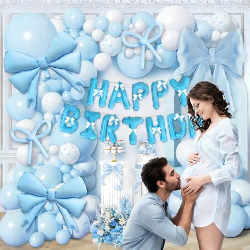 Deze set bevat een macaron-blauwe ballon van 5 inch, 10 inch, 12 inch en 18 inch, een matwitte kleur van 5 inch, 10 inch, een gelukkige verjaardagsbanner, een folie-makaron-blauwe boogballon, een macaron-blauwe 260 lange ballon, een lintstrik, een lijmpunt en een ballondecoratiestrip.