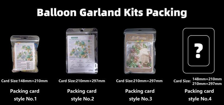 Voor de verpakking van de ballonkits, als u alleen de verpakkingskaarten aanpast, is de moq 50 sets, als de buitenverpakking op maat is gemaakt, is de moq 500 stuks.