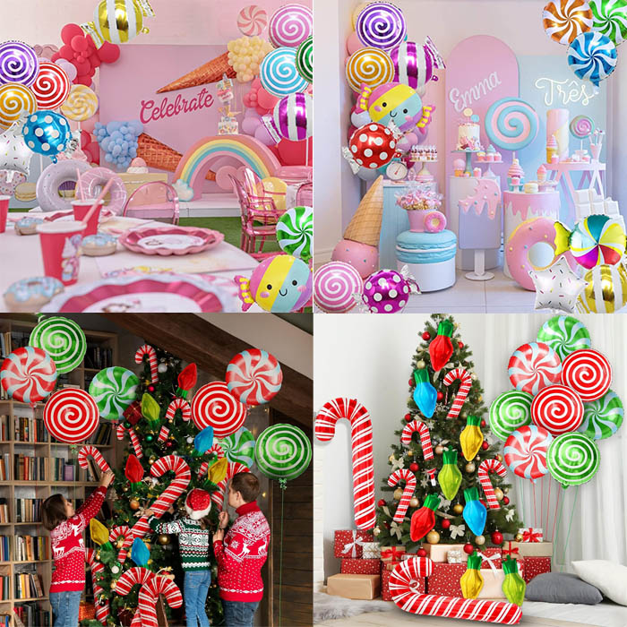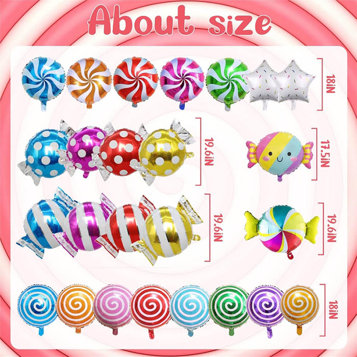 Folieballonnen uit de Candy-serie zijn momenteel verkrijgbaar in verschillende kleuren en stijlen, waardoor een nieuwe feestdecoratie met snoepthema ontstaat voor volwassenen, kinderen, jongens, meisjes en mensen van alle leeftijden. Heldere en kleurrijke ballonnen met kerstsnoepthema, een schattig feestfolieballonpak met lolly-thema is een leuke toevoeging aan uw feestdecoratie met verjaardagsthema. De snoepfolieballon past perfect bij andere snoepfeestdecoraties en is een prachtig cadeau, achtergrond en fotorekwisieten voor vrienden die van lolly's houden.