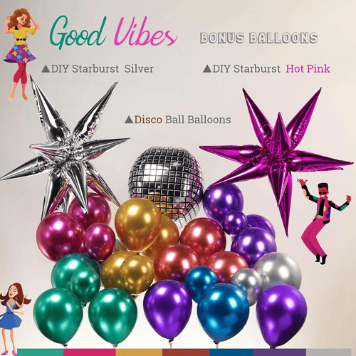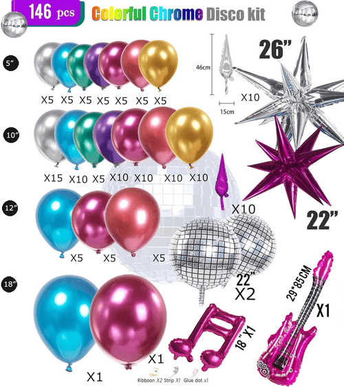 Dedisco ballonboog kitbestaat vooral uitkleurrijke latexballonnen Endiverse folieballonnen. Om de glanzende chroomstijl te creëren, zijn de door ons geleverde latexballonnen metallic latexballonnen, hun oppervlakken hebben een zeer mooie metaalachtige glans en ze kunnen zowel binnen als buiten uitstekende resultaten bereiken. De maten ervan zijn 5 inch, 10 inch, 12 inch en 18 inch.