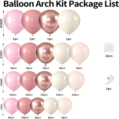 Stoffige roze ballon kleine kit:Deze kleine kit bestaat uit 50 tot 80 stuks roze ballonnen. Om het gelaagdheidseffect van de set te versterken, kun je ook witte, abrikozenkleurige en transparante ballonnen toevoegen. Gebruik helium om ze te vullen en dan kun je een lint gebruiken om ze vast te binden en ze vervolgens in de lucht te laten zweven.