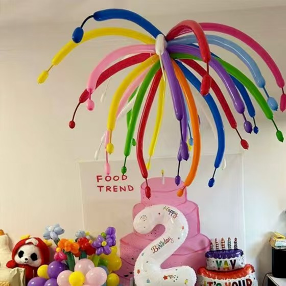 Voor vormontwerp. De inspiratie komt van vuurwerk dat barst in de nachtelijke hemel. Ze zijn helder, dynamisch en opvallend. Het kopieert perfect de vorm van vuurwerk wanneer ze barsten. Lange ballonstrips strekken zich uit en verspreid uit het midden. Kleine ballonnen worden aan de uiteinden toegevoegd. Ze zien eruit als vonken van exploderende vuurwerk. Levensecht en levendig. Hang ze op het feestplafond. Of leg ze op de grond als decoratieve pilaren. Ze creëren een prachtig visueel effect van vuurwerk dat onmiddellijk barst. Feestgasten zullen het gevoel hebben dat ze zich in een vuurwerkshow bevinden. Ondergedompeld in een gelukkige en levendige sfeer. Ook is de ballonbasis onderaan goed ontworpen. Vuurwerkvormige ballonnen met verschillende kleurenwedstrijden. Hun bases gebruiken bijpassende balloncombinaties. De basis houdt de ballon stabiel. Het verbetert ook de algehele decoratieve schoonheid. Maakt de hele vuurwerkvormige ballon van boven naar beneden geïntegreerd. Wordt een prachtig gezicht op het feest.