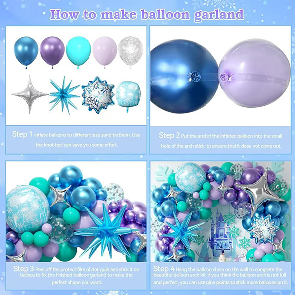Naast gewone ballonnen bevat de kit veel themavormige elementen. Er zijn grote sneeuwvlokfolieballonnen. Ze hebben delicate texturen. Ze lijken op de magische sneeuwvlokken die Elsa in de film heeft gemaakt. Je kunt ze gebruiken om een boog te bouwen. Je kunt ze ook gebruiken om een achtergrondmuur te versieren. Deze kleuren lopen in elkaar over. Ze creëren meteen een sfeer alsof je in een ijs- en sneeuwkoninkrijk bent.