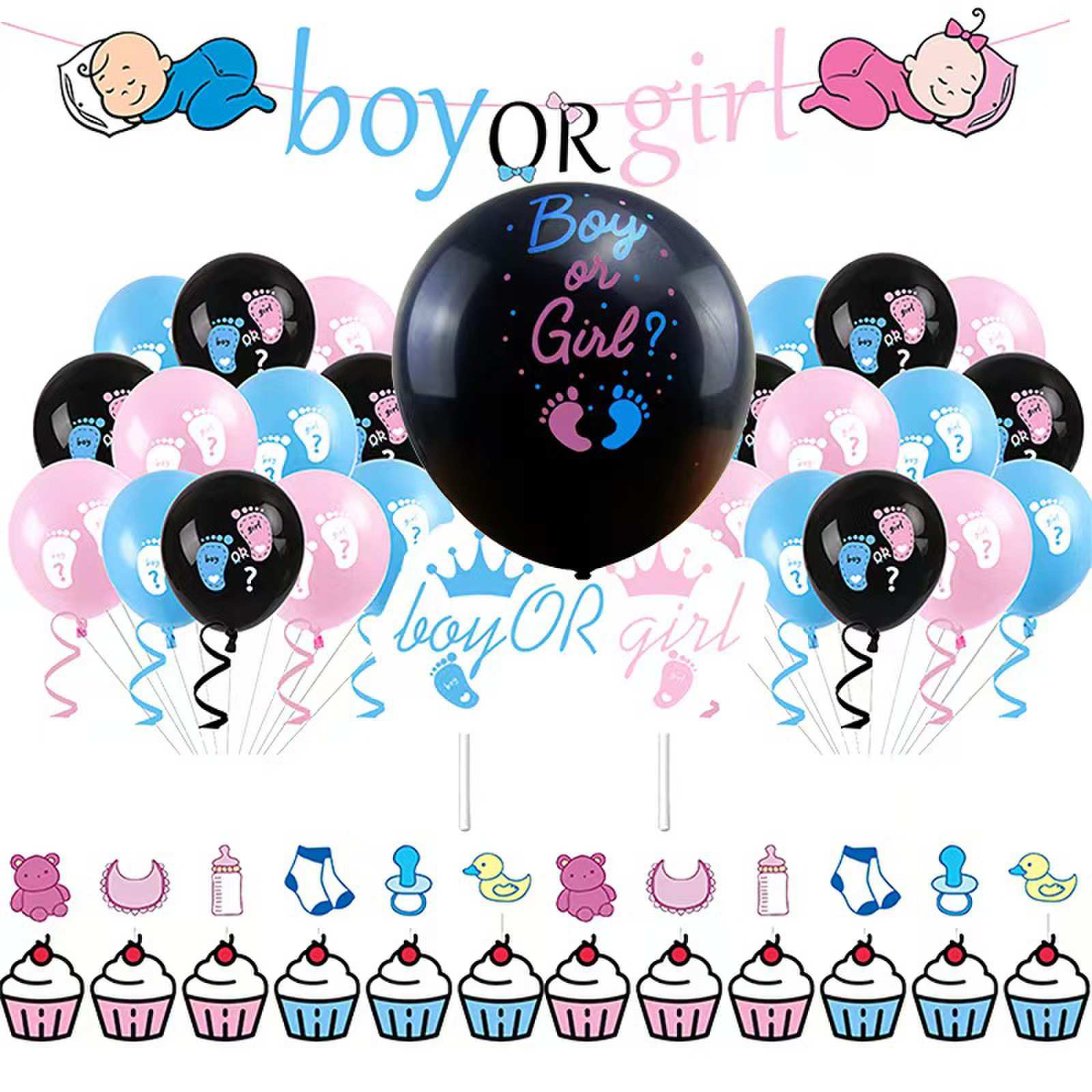 De basisballonset is voornamelijk afgestemd op de twee hoofdkleuren roze en blauw, en er zijn enkele paillettenballonnen en aluminium letterballonnen van dezelfde kleur toegevoegd als decoratie.