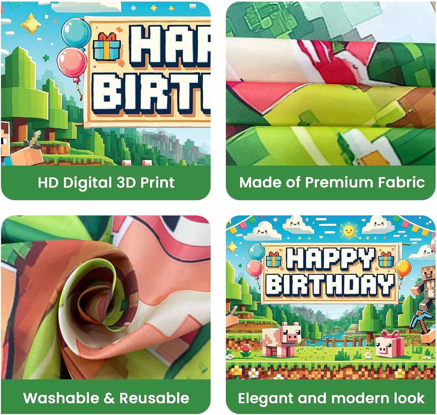 De Minecraft -achtergrond is het belangrijkste visuele deel van de feestscene. Het ontwerp neemt ideeën uit klassieke game -onderdelen. Het toont pixelhemel, gras, bomen, gebouwen en Steve. Deze onderdelen doen zich aan om een volledig blokwereldscene te maken. De foto heeft een heldere kleur. De foto heeft rijke lagen. De woorden gelukkige verjaardag in pixelstijl zien er duidelijk uit. De woorden vallen het oog. Door de achtergrond voelt het feest plaats als een spel in één keer.