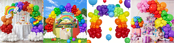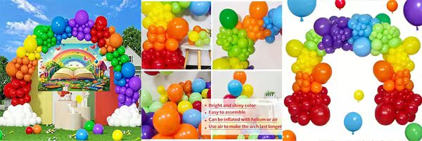 NouN prachtigFeestdecoraties met regenboogthema bestaan uit zeven levendige kleuren regenboogballonnen, die een vleugje kleur toevoegen aan uw feest. Gebruik deze regenboogballonboogset om een levendige regenboogballonboog, achtergrond, middelpunt en entree te creëren voor uw feest met regenboogthema.