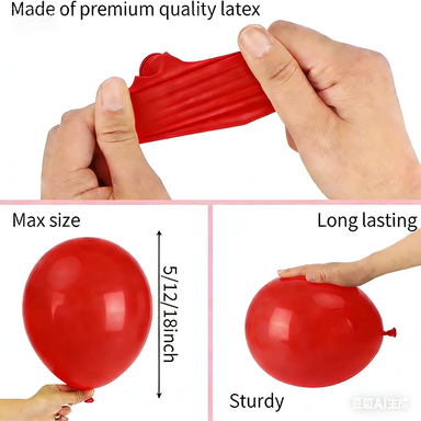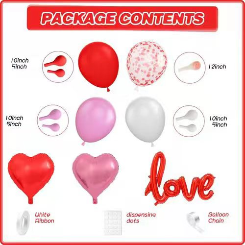 Deze ballonnenkit bestaat voornamelijk uit:latex ballonnenen meerderefolie ballon. De latexballonnen ervan zijn rood, roze en wit. Ze zijn gemaakt van 100% natuurlijke latex, die volledig milieuvriendelijk en onschadelijk is voor het menselijk lichaam. En de grootte ervan is ook verschillend. Om een mooi laagje te zetten zijn de latexballonmaten van 5 inch tot en met 12 inch. Het rangschikken in de set is heel eenvoudig, ook de puntlijm en de ballonketting maken we ermee klaar. Dus terwijl u het regelt, kunt u het met flexibiliteit doen.