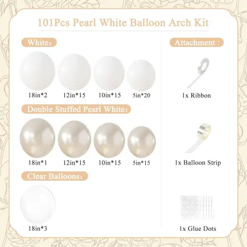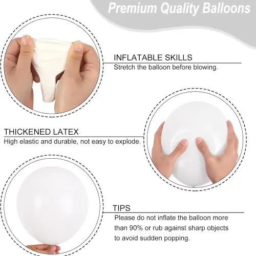 Er zijn ballonnenstippen, ballonstrips, linten en ballonbanden in elke witte huwelijksballonboog. Ze zijn allemaal zorgvuldig op elkaar afgestemd om een mooi en samenhangend huwelijksdecoratie-effect te creëren.